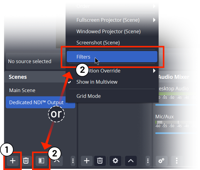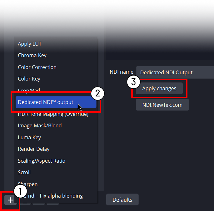 Dans la fenêtre contextuelle Filtres, (1) créez un nouveau filtre en cliquant sur l'icône plus (+), (2) puis sélectionnez "Dedicated NDI Output". (3) Appliquer les changements