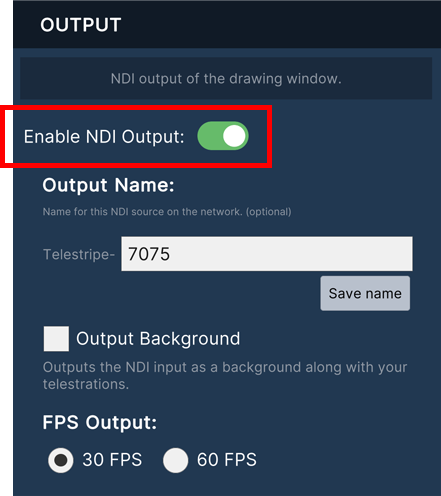 Dans l'onglet Vidéo de la section Paramètres, activez la case à cocher "Activer la sortie NDI". En option, vous pouvez modifier le "Nom de la sortie". Par défaut, un numéro aléatoire à 4 chiffres lui est attribué. Ce numéro est uniquement utilisé pour vous permettre de l'identifier plus facilement sur le réseau.