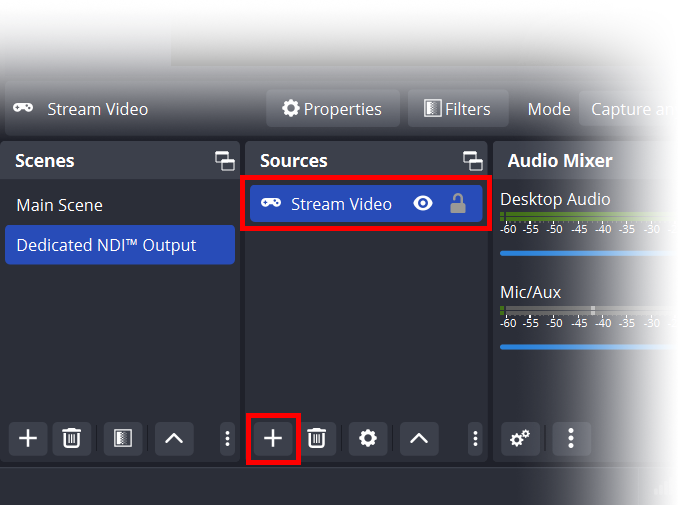Dans OBS, dans votre scène principale, cliquez sur le bouton plus (+) en bas de la section Sources. Sélectionnez NDI™ Source. Une fenêtre contextuelle s'ouvre.
