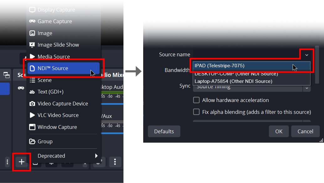 Sous Source Name, sélectionnez la liste déroulante, puis le nom NDI™ que vous avez choisi lors de la configuration de votre NDI™ Output dans l'app Telestripe. Cliquez sur OK.