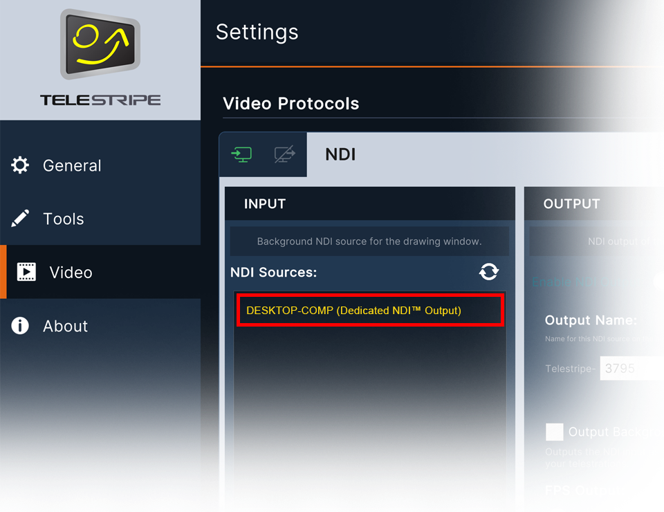 Dans l'application Telestripe, ouvrez le menu Settings (menu hamburger en haut à gauche), puis cliquez sur l'onglet Video. Vous devriez voir votre sortie OBS Dedicated NDI dans la section INPUT. Cliquez simplement dessus pour la sélectionner.